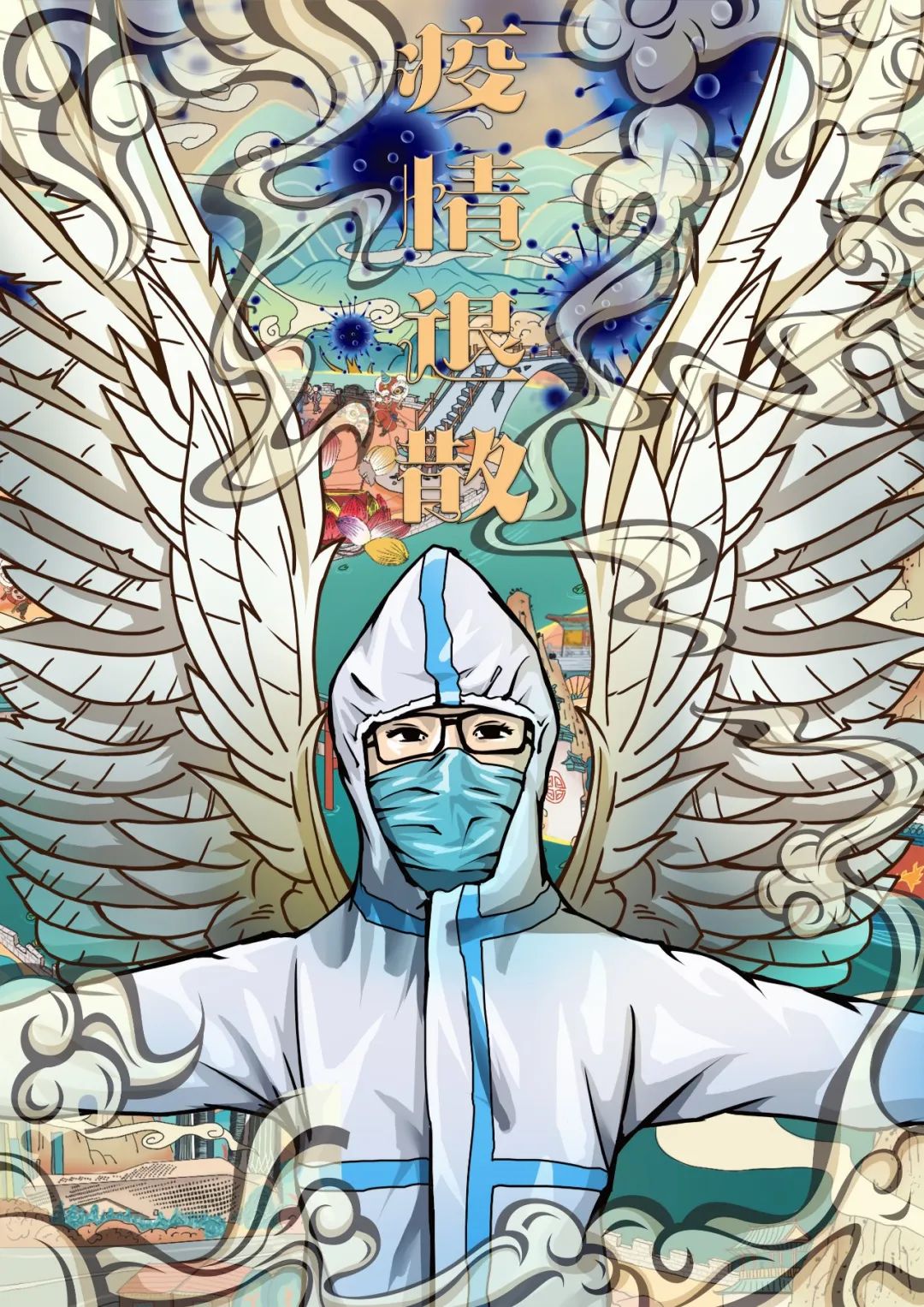 这部作品的内容是“大白”背对着病毒张开翅膀保护我们(观众视角)。我们最终选择“大白”作为对抗疫情的守护者的意象,一是由于其为市民们最常见的人物群像之一,二是致敬电影《超能陆战队》中踏实能干、舍己为人、品德高尚的角色机器人大白。“翅膀”元素源于宗教概念中“天使”保护信徒(人民)不被恶魔(冠状病毒)侵扰的意义。整体构图参考了符咒的绘图,我们希望能通过它强化人民群众抗疫的信心以及传达祈福消灾的想法。
