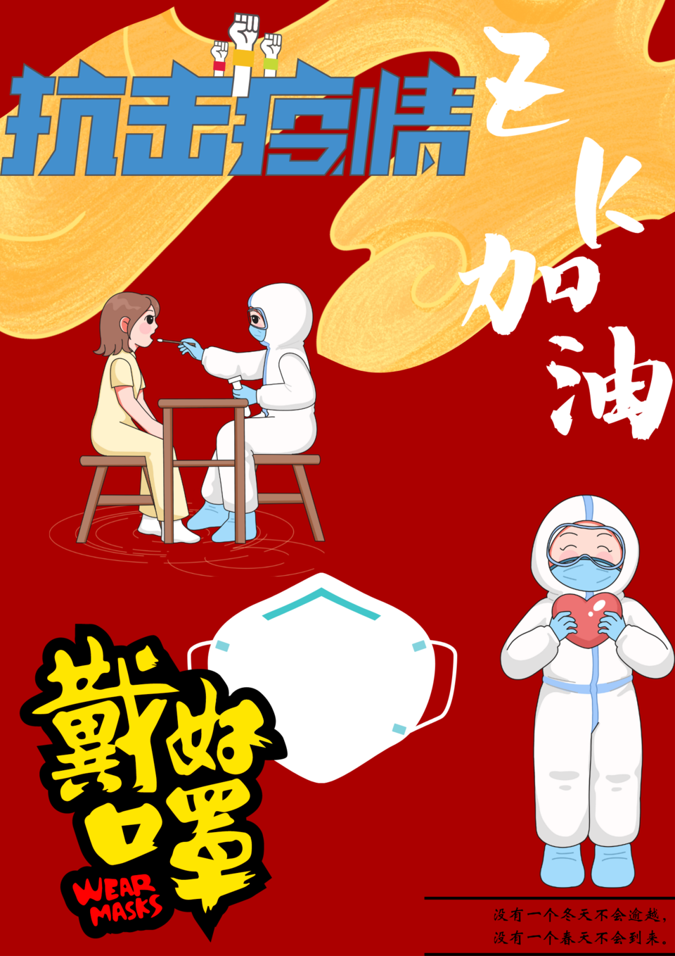 仲园再次迎来了疫情的挑战,而我们要为仲园的安全撑起一把伞,疫情之下,我们每个人都是要众志成城,共同抗疫,作品以红色为底,表明了我们抗疫的决心与抗疫成功的信心,医护人员每日为我们进行核酸检测值得我们致敬,而我们也应该戴好口罩,疫情之下做好个人防护,ZK加油的侧标题点名了面对疫情时我们要共同努力加油!