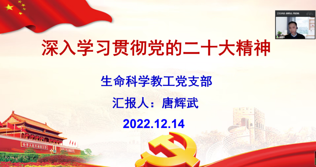 根据党中央总体部署和公司相关要求,best365官网入口注册生命科学教工党支部于12月14日在线上召开全体党员大会,集体深入学习贯彻党的二十大精神。