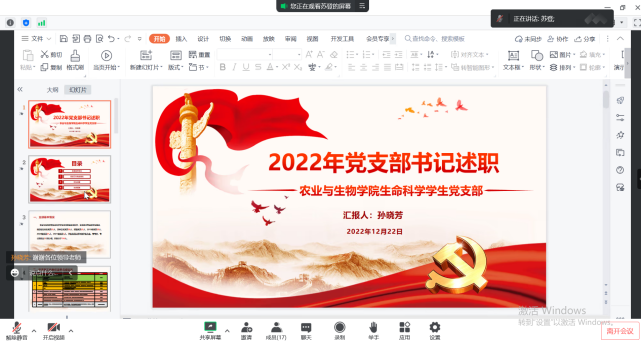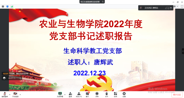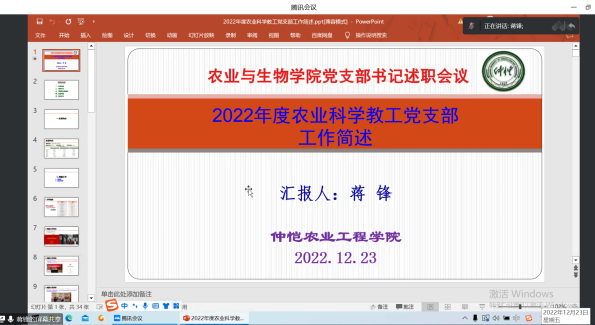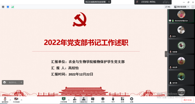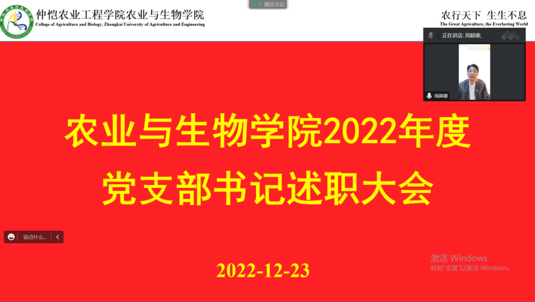 根据公司党委《关于做好2022年度党组织书记抓基层党建述职评议考核工作的通知》(仲组字〔2022〕12号)精神,12月23日下午,农业与生物公司党委在腾讯会议APP召开2022年度党支部书记述职评议大会。会议由公司党委副书记周超雄主持,公司领导班子成员,各党支部书记、支部委员和办公室副主任参会。