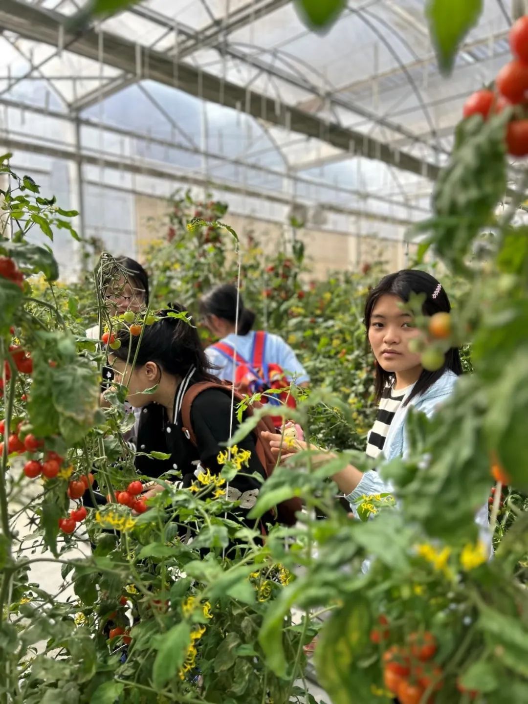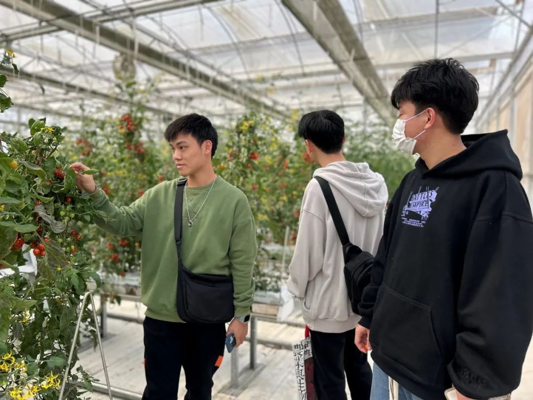 随后,老师带领同学们参观了校园里的农场,对种植的农作物及作物上的一些病虫害进行了简单的介绍,同学们收获颇多。之后还一起参观了玻璃温室中立体种植的圣女果、草莓等,了解了水肥一体化及立体种植的相关知识,在陈青春老师的带领下,同学们品尝并采摘了番茄,深感满足。