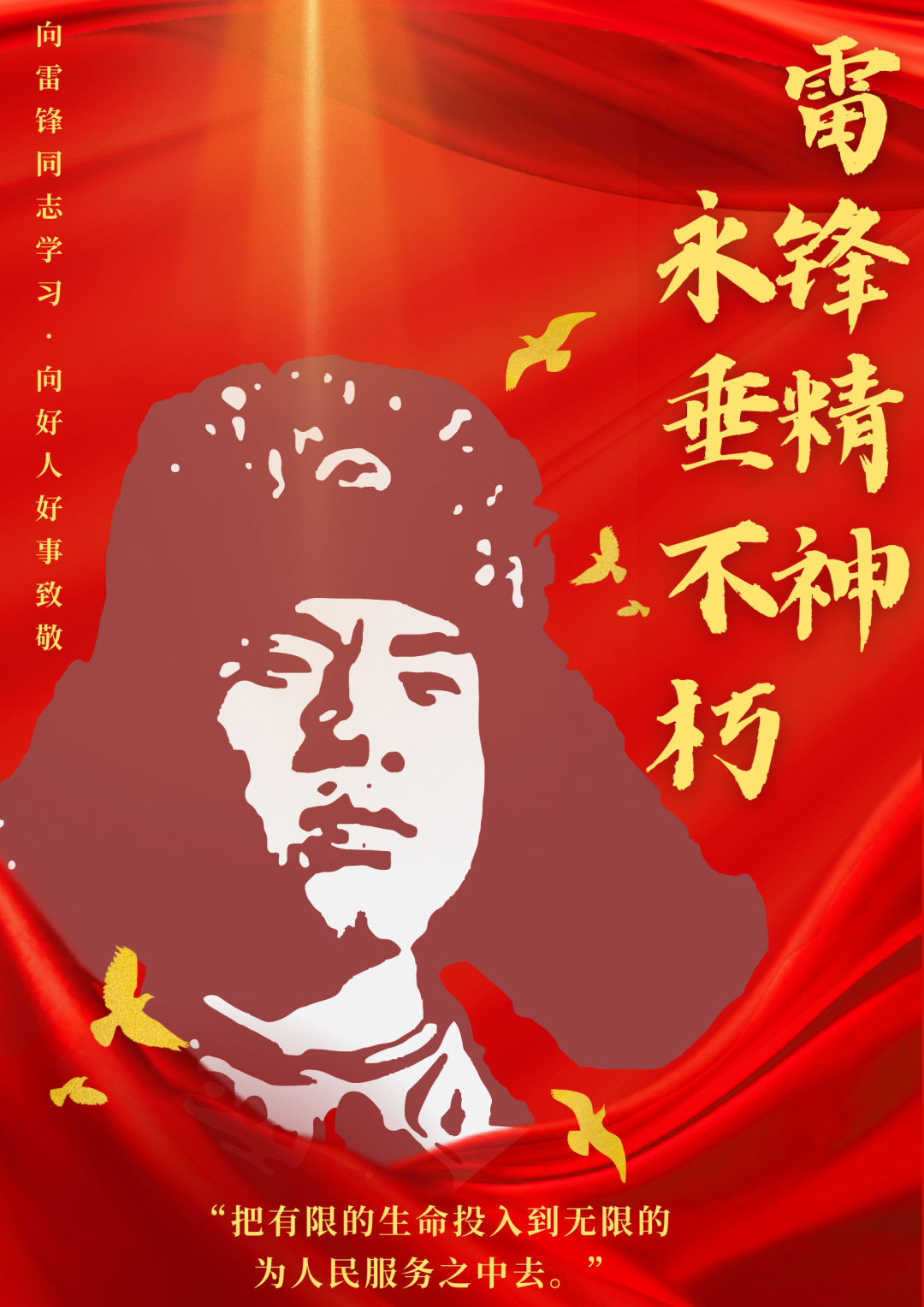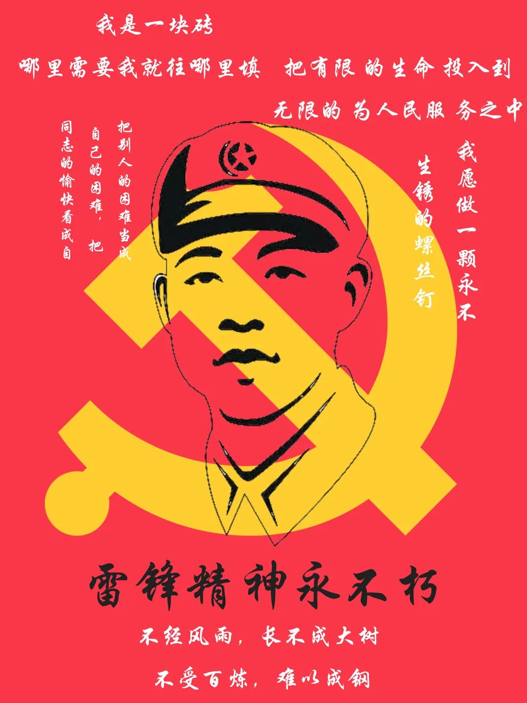 作品介绍:阳春三月,全国上下洋溢向雷锋精神学习好气象。雷锋“干一行、爱一行、钻一行、精一行”,甘愿在平凡工作岗位上做一颗永不生锈的螺丝钉,把自己的青春投入到全心全意为人民服务之中的高尚品德,不仅值得我们新时代青年弘扬与传承,还需要我们把这种精神带入到祖国的建设中去,方能早日实现中华民族的伟大复兴。本作品以简约的风格,阐述了伟大的雷锋精神。