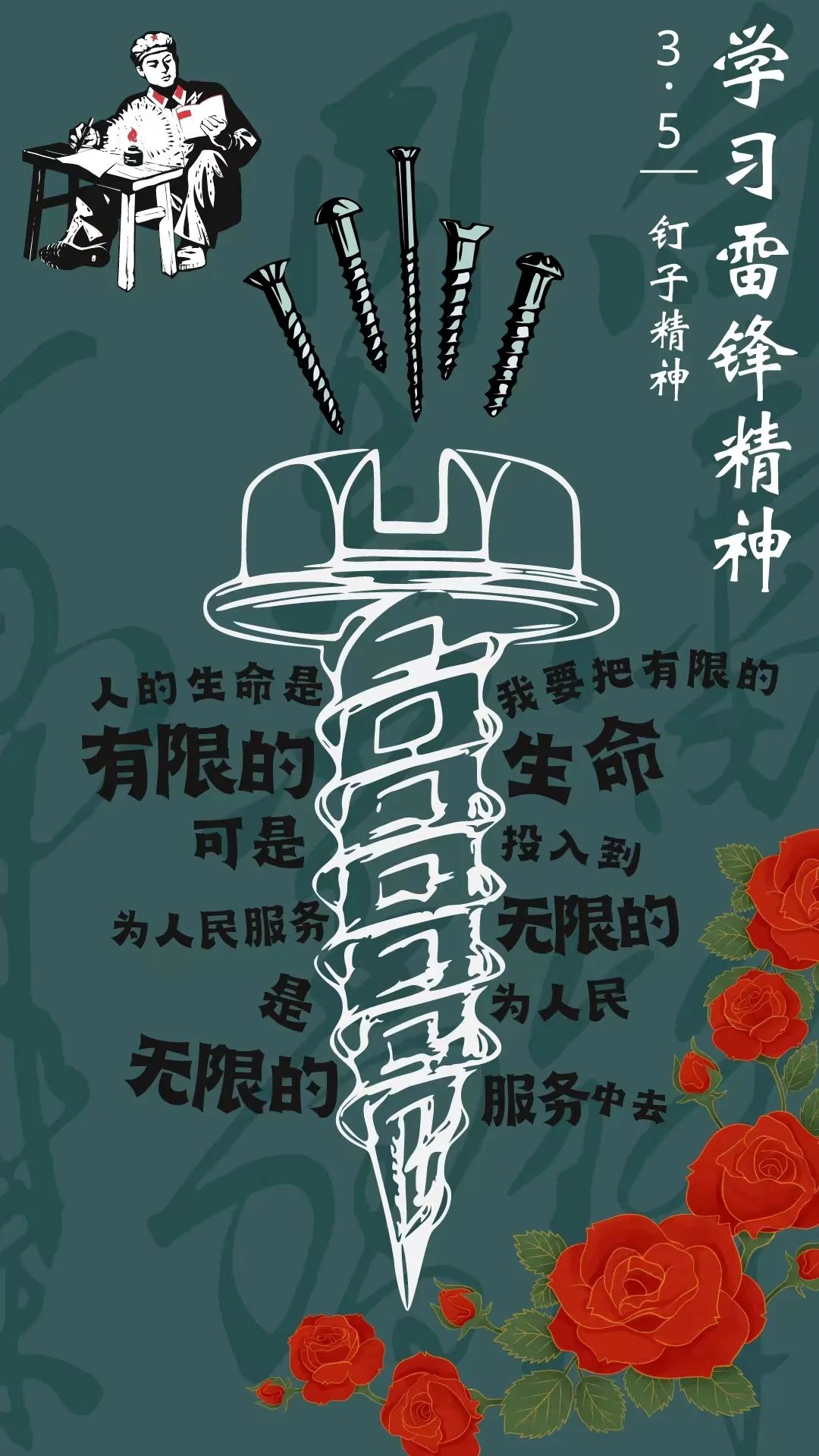 作品介绍:三月春风处处,雷锋日悄悄来临。雷锋,不止是一个名字,更是一种精神,一座丰碑,激励了一代代人多行善举、不做恶行。海报中央是一个大钉子,寓意着钉子精神,旁边有着雷锋的名言,右下角是玫瑰,寓意着“赠人玫瑰,手有余香”。海报以“钉子精神”为主题,用钉子精神激励新时代青年,做一颗永不生锈的螺丝钉。