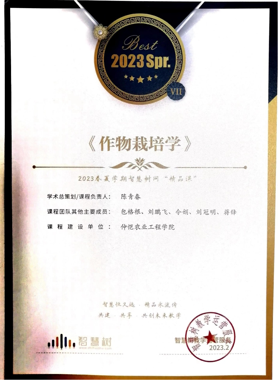 近日,由公司作物栽培学教学团队共同建设的在线开放课程《作物栽培学》喜获2023春夏学期智慧树网“本科高校精品课程”。
