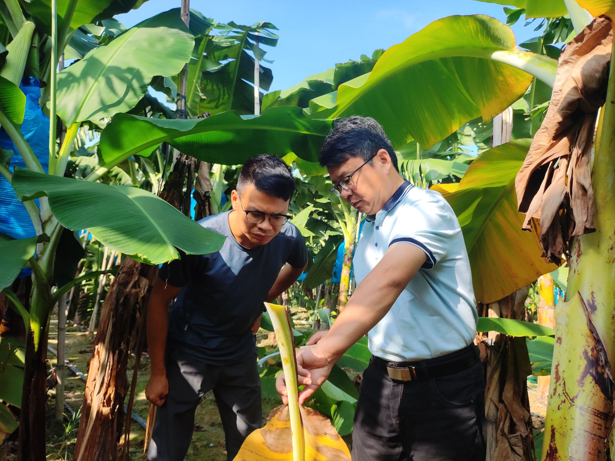 自2019年开始,喻国辉教授带领团队在上述地区开展研究工作,他们的目标是实现香蕉枯萎病的可持续绿色防控。这种防控方式不仅对环境友好,而且可确保香蕉的产量和品质。在广东省农业农村厅2023年乡村振兴战略专项-动植物疫病防控项目资金的支持下,喻国辉教授团队与佛山三水、恩平圣堂和阳江阳春的种植大户签订合作协议,建设了500亩以上的香蕉枯萎病绿色防控示范基地,为农户免费提供用于防控的微生物菌剂,并通过线上指导和定期现场调查,确保示范效果。