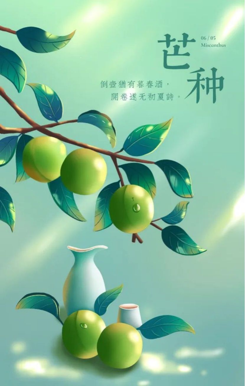 芒种,是二十四节气之第九个节气,夏季的第三个节气,干支历午月的起始。斗指巳,太阳黄经达75°,于每年公历6月5-7日交节。“芒种”一词,现存文字记载最早见于两汉时期的著作《周礼》:“泽草所生,种之芒种。”元代文人吴澄编著的《月令七十二侯集解》:“五月节,谓有芒之种谷可稼种矣。”《通纬·孝经援神契》中说:“小满后十五日,斗指巳,迁寒兵燥为芒种,五月节。”
