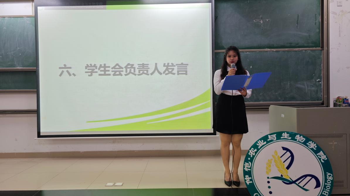 随后胡郑潇作为团委代表进行发言。他先回顾总结了上学期的工作,他表示作为员工干部,要坚持思想引领,同广大同学们一起筑牢红色思想信仰,树立与时代进步潮流相适应的思想观念。他希望大家心往一处想劲往一处使,求真务实,开拓创新,在建设美好农生的过程中贡献自己的力量。