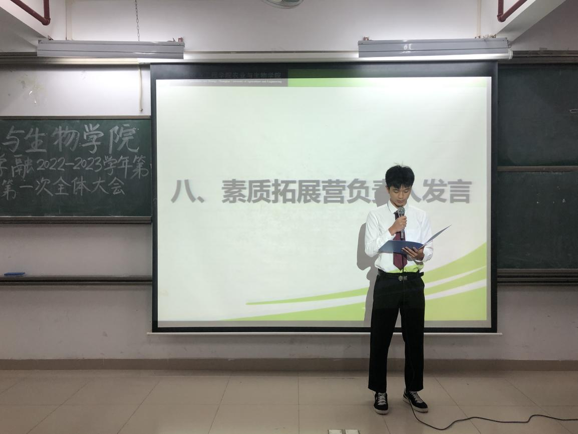 随后吴煜麒代表素质拓展营进行发言。他表示,成立素质拓展营旨在为农生院的同学们提供一个展现自己,发现自己的平台。他希望在大家的共同努力下,素质拓展营能更好地调动全院员工的积极性,为公司的发展贡献出自己的一份力量。