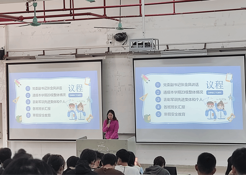 邝健睿从国防教育知识竞赛、员工手册考试、宿舍检查评分、早读缺勤通报、阳光晨跑活动、运动会组织参与以及各班集体和个人获奖统计等各方面情况展示了23级各班在本学期的整体表现。她充分肯定了同学们在本学期取得的各方面成绩,希望全年级各班要向表现优秀的班集体看齐,互相学习、取长补短、争先创优。她鼓励全体同学要积极参加公司各项文体活动、学科专业竞赛和社团实践项目,不断历练、积累经验,更好地丰富和充实自己的老员工活和人生体验。同时,要坚持晨跑和晨读,培养自律的良好习惯,加强运动和锻炼,以饱满的精神状态和健康的身体素质应对下学期的各项挑战。