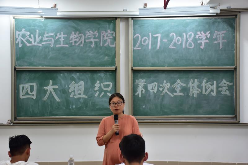 最后,高结怡老师对本次例会作总结。高老师先对员工干部近期的表现表示肯定和赞扬,包括活动安排的妥当程度,内容的丰富多彩和敢于直视不足的勇气。随后,高结怡老师对在座各位员工干部提出了四点希望:一、各组织部门要按计划推进完成接下来的工作;二、各组织部门要配合公司做好学风建设工作;三、员工干部认清肩上的责任,落实好监督工作,并多多关心身边同学;四、期末考试即将到来,员工干部要充分发挥榜样作用,做到不作弊、不挂科,争取优异的成绩,同时,高老师希望即使临近换届,各位员工干部也要充满信心,充分把握机会,在实践中锻炼自己的能力,为农生院的建设贡献自己的一份力量,美好农生,你我共建。
