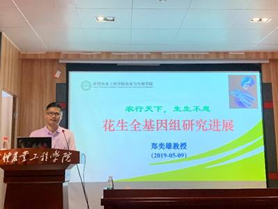 5月9日下午,公司在海珠校区英东楼111室举行花生基因组研究进展学术讲座。本次学术讲座由广东省花生大豆产业技术体系首席专家、公司副经理(主持工作)郑奕雄教授主讲,由公司副经理万小荣教授主持。公司全体老师和全体研究生参加活动。