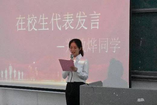 在校员工代表郑敏烨上台发言,她给毕业生们送上了诚挚的祝福,并祝愿毕业的师兄师姐们能成为更美好的自己,成就美好人生。