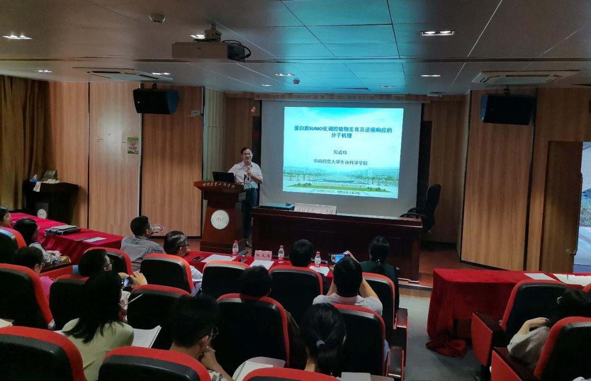 随后,阳成伟教授作了题为《蛋白质SUMO化调控植物发育及逆境响应的分子机理》的学术报告。阳教授先介绍了SUMO化修饰的含义,介绍了其团队围绕拟南芥SUMO连接酶MMS21开展的工作,揭示了蛋白质SUMO化修饰在调控植物主根发育和DNA损伤修复中的作用机理。阳教授的报告内容丰富、深入浅出、层层递进。