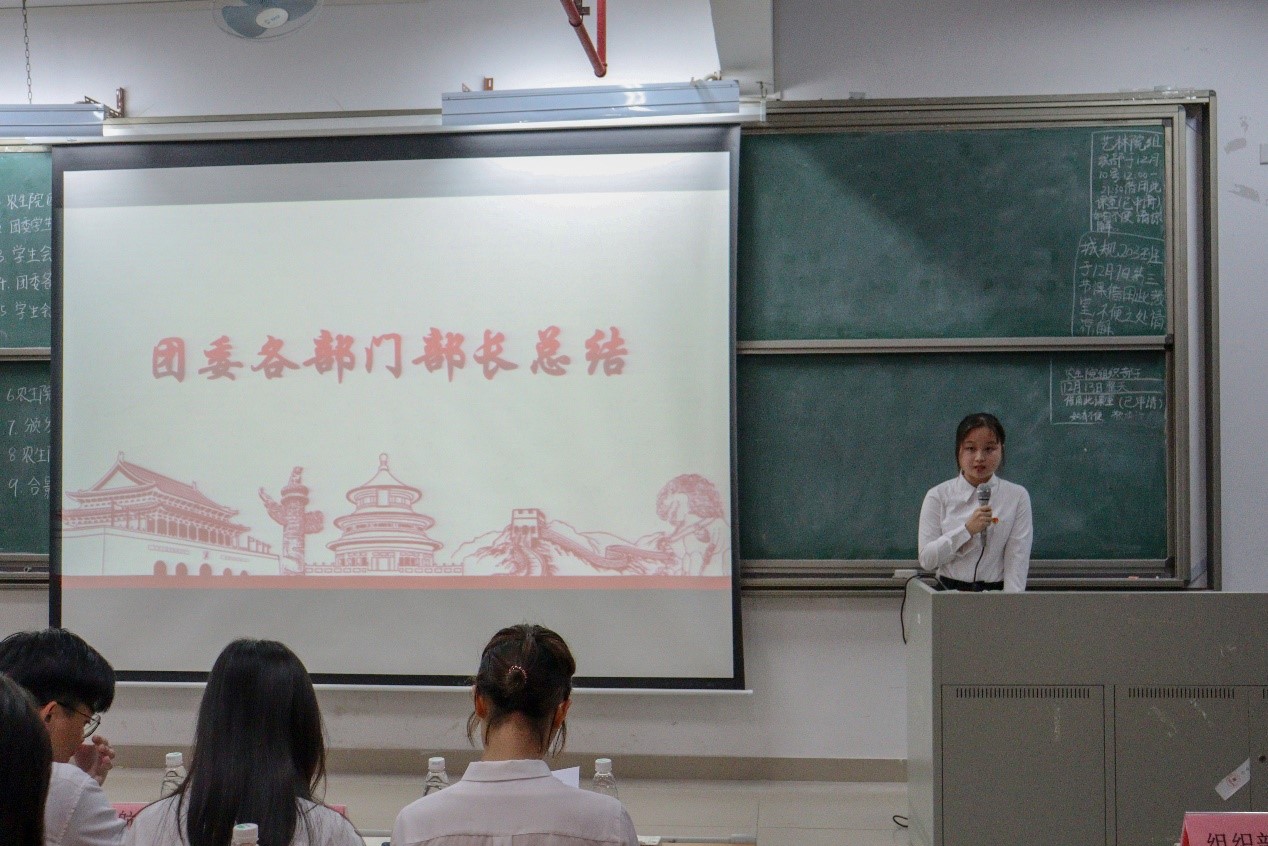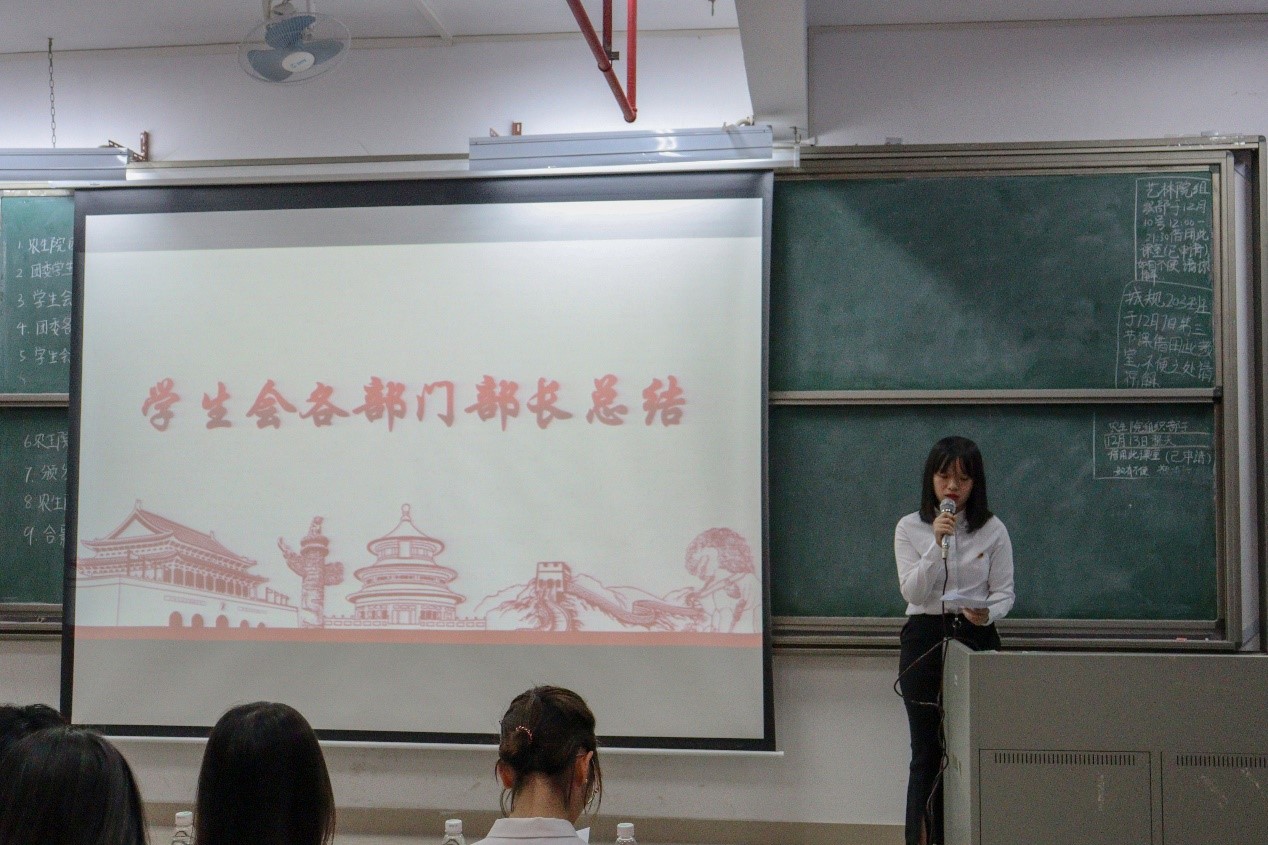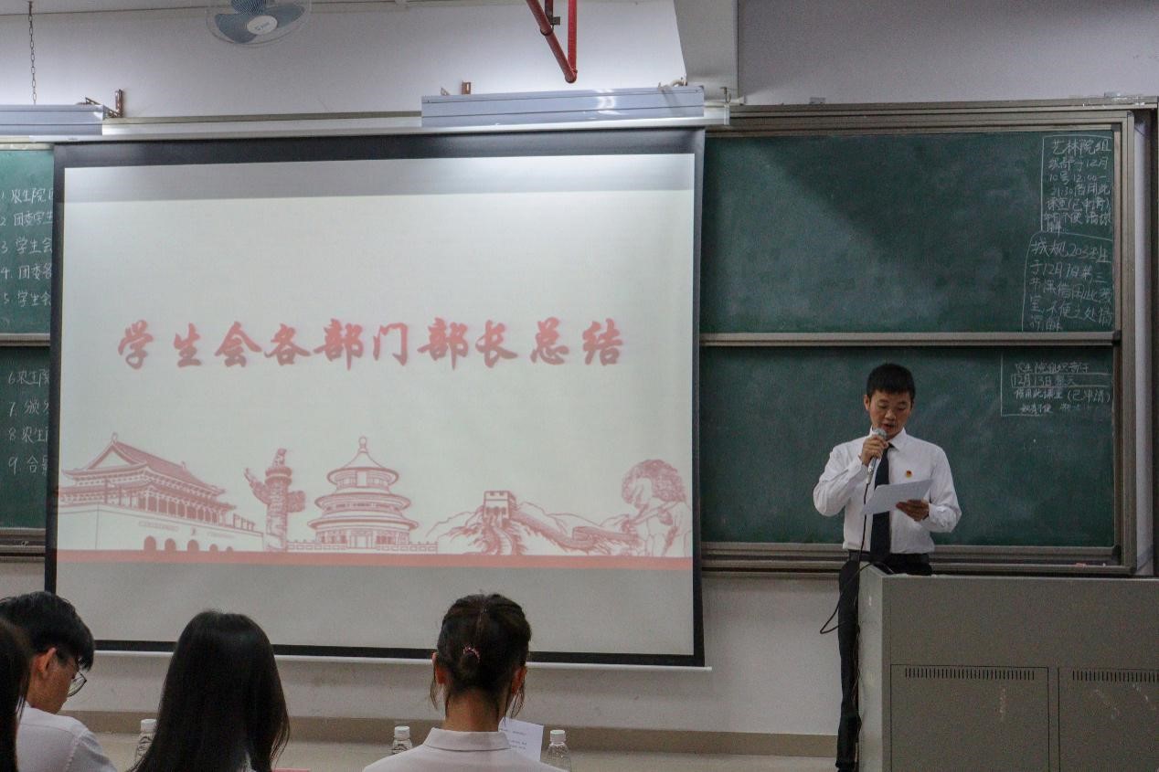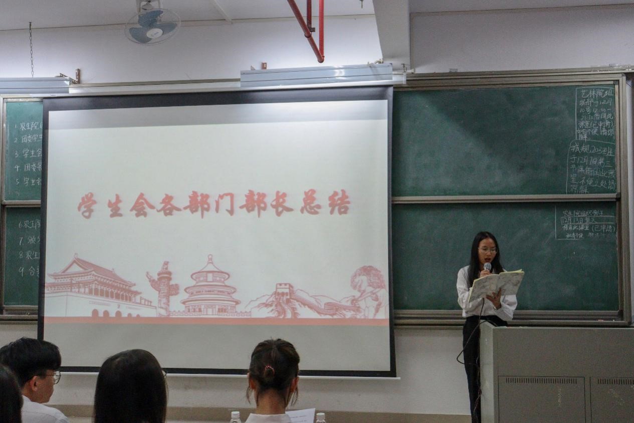 接着由林伊纯同学上台发言,她从组织建设和校园文化活动两个方面介绍了工作中取得的成绩和存在的不足。随后由员工会执行主席区涣彩从员工会职责以及各部门在活动中的表现进行工作总结并对自己未来的工作提出要求。紧接着,由团委办公室、组织部、宣编部、新闻媒体部、实践调研部、易班工作站、青协以及员工会班委部、学业部、心理与健康服务部、文体部、公关部的代表们依次上台发言,他们对近期本部门的工作内容做了详细汇报,并指出了工作中所取得的成绩和存在的不足之处,此外,他们还讲述了12月的工作计划和展望。各部门负责人的总结发言后,苏登宣读了第二届团学组织主要干部名单,公司党总支副书记周超雄和苏登为主要干部颁发聘书。