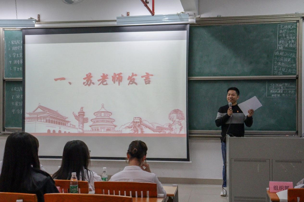 会上,苏登对团学组织新成员的加入表示热烈欢迎,并对团学干部近期的工作表现表示肯定。当天正好是一二九运动85周年纪念日,他强调,团委的干部们要做好团员青年的思想引领工作。接着,他指出,员工会是连接老师和员工之间的重要桥梁,今年是员工会第一次改革,员工会的干部们要对自己的职责做出清晰的定位。最后他对干部们提出了三点希望:第一,以学习为主要任务。老员工的首要任务就是学习,作为团学的干部要做到上课不迟到不早退,更不能出现挂科的现象;第二,坚定理想信念。团学的干部们都应该制定好自己大学的目标,并为之努力奋斗;第三,深入了解同学们的需求,搭好员工与老师之间沟通的桥梁。