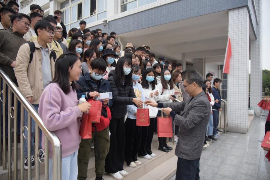 接着,周超雄副书记在“金榜题名”签名榜上写下八字祝语“登高望远,极目远眺”送给即将奔赴考研战场的考生们。他祝愿学子们都能登上高峰,为理想而努力奋斗,不断地追求人生的更高点。同时,他强调,个人的进步和追求与祖国实现伟大复兴计划、“十四五”规划建设以及开启伟大的现代化征程分不开的,他希望每一位学子们都能成为追梦人,为建设祖国贡献出属于自己的力量!最后,他向同学们提出三点温馨提示:一、注意饮食和作息,做好保暖措施。二、保持冷静的心态,在考场上镇定的心态是胜利的关键。三、无论考试结果如何,都要保持乐观积极的心态。最后,他祝愿所有考研学子在考场上稳定发挥、旗开得胜、金榜题名!