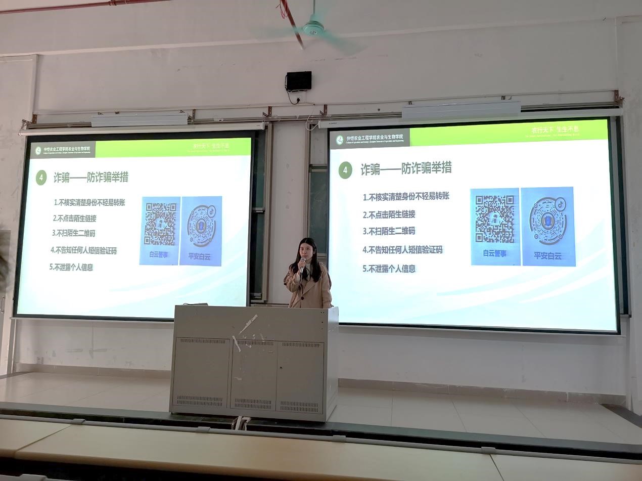 会上,肖芳芳老师重点强调了两个问题。第一,安全问题。由于刚刚开学,大公司园中诈骗案件频发,诈骗类型繁多。肖芳芳老师通过一些近期发生的真实案例,向同学们分析了诈骗常用的手段和类型,并提醒大家要提高防范意识和防诈骗能力,不轻信陌生来电,保护好自己的人身安全和财产安全。