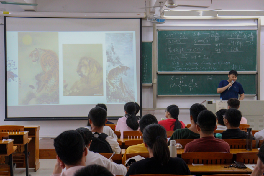会上,李城向同学们介绍了何香凝先生传奇的一生,她的一生就犹如她笔下的画遒劲有力、气度恢弘。或许正是因为如此,她才能把狮虎勾勒出祖国的模样。乱世之中,何香凝与廖仲恺先生相依为命,携手并进,坚决支持“联俄、联共、扶助农工”的三大政策。为救丈夫,她孤身入虎穴;痛失所爱后,她带着自己与丈夫廖仲恺先生的志向继续与反革命派作斗争。1927年,何香凝先生回到广州创办“仲恺农工公司”,践行“扶助农工”的志向。1937年全面抗战爆发后,近花甲之年的何香凝先生爱国之志老而弥坚,对救亡运动热情支持,并始终不忘将妇女解放与抗日救亡运动紧密结合起来。