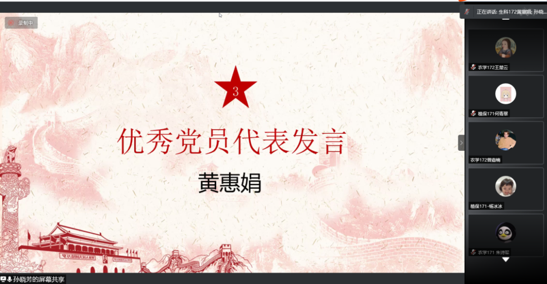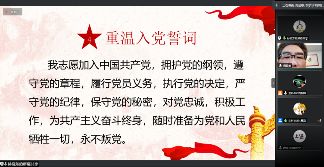 大会第四项,周超雄带领17级全体党员重温入党誓词,铭记庄严承诺,再次接受心灵的洗礼。虽然看不见彼此的脸庞,但我们知道每一个屏幕前都有一名党员正在庄严地宣誓,那铿锵有力的宣誓声深深地印在我们的心中,让我们牢记作为一名党员的职责和使命。