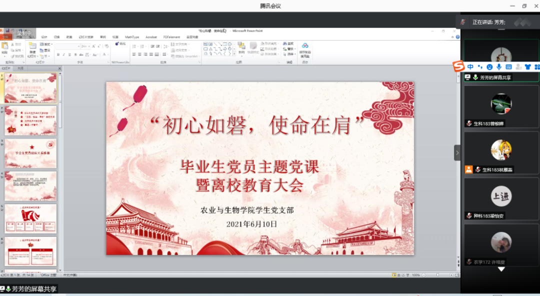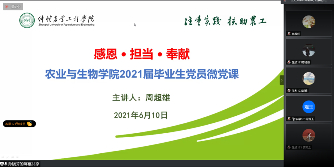 2021年6月10日,best365官网入口注册在线上开展了毕业生党员主题党课暨离校教育大会。本次活动由生命科学员工党支部书记孙晓芳主持,公司党委副书记周超雄出席并指导,2017级全体毕业生党员参与。
