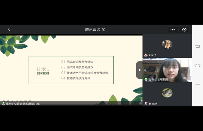 在会议中,黄惠娟分别从笔试、面试、普通话水平测试和教团队格认定等四个方面为同学们介绍了教团队格证的考试流程并提出了自己的备考建议。她还详细解答了同学们提出的问题,解开了同学们的一些关于考试的疑惑。