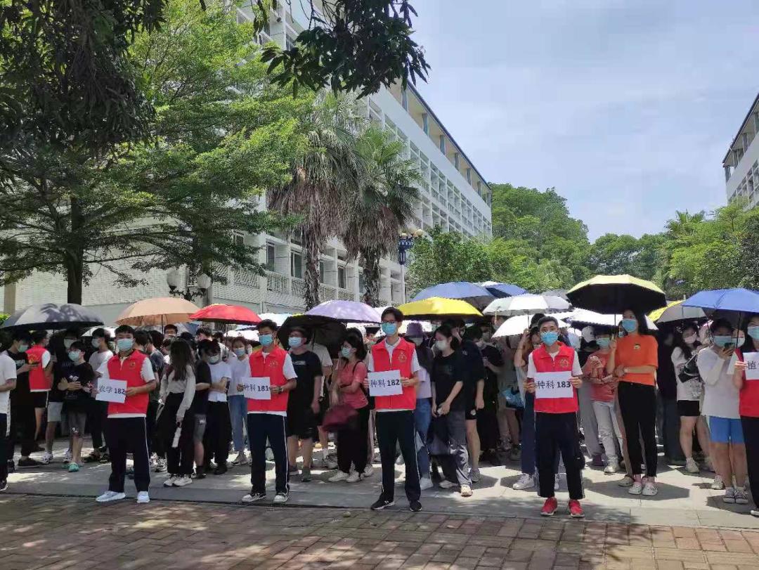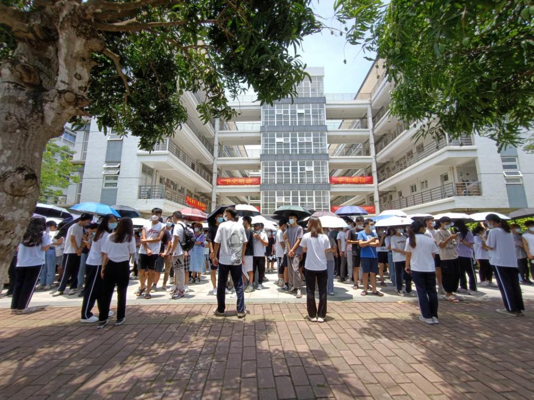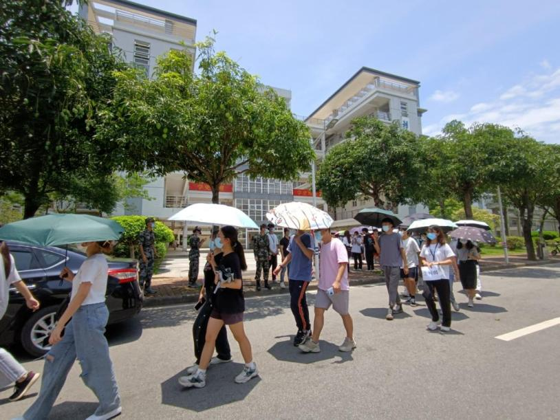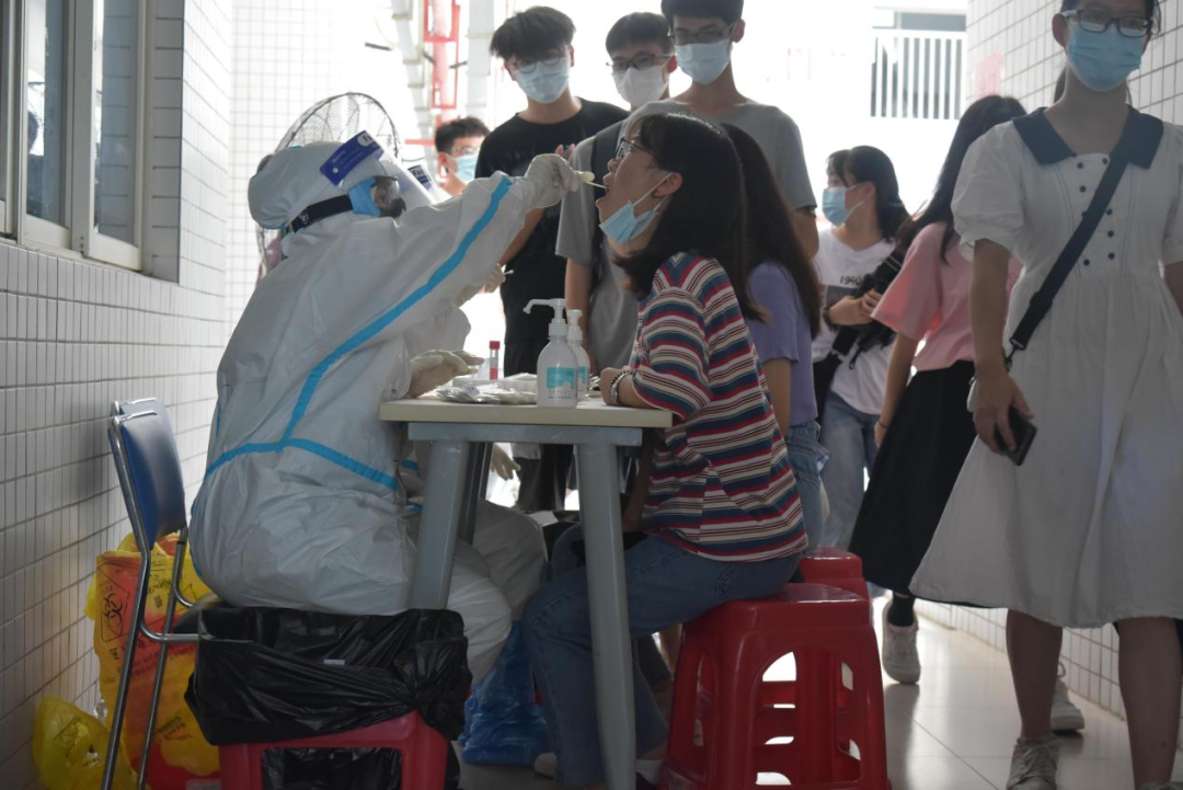在检测现场,医护人员们全副武装,即使天气炎热,他们依旧坚守于核酸采集的第一线,一丝不苟地为每一位师生进行核酸采样检测。同时,我们的员工工作人员以及志愿者们也坚守在自己的岗位上,积极配合医护人员的工作,各司其职,做好自己的本职工作,确保检测工作的有序进行。他们体现出和病毒竞跑的“速度和激情”,是“以人民为中心”的责任和担当。同时间赛跑,和疫情较量,不愧为烈日下最美的“战疫”英雄。