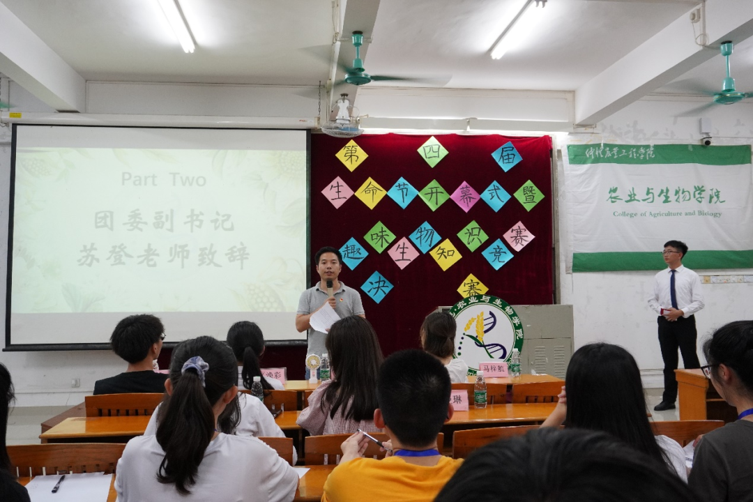 首先举行的是第四届生命节开幕式。仪式上,员工骨干代表王柄森带大家回顾了往届生命节的精彩现场,随后他介绍了本届生命节的主要活动:趣味生物知识竞赛、种子画大赛和健康素养知识竞赛。最后,由团委副书记苏登老师致辞,首先他对参赛了到来的同学们表示了欢迎,他希望各班级的同学能积极参加公司举办的类似活动,本次活动主题为“探索生命、感悟生命、绽放生命”,生命节的举办是对同学们专业知识的一次考验,其中涉及到很多的专业知识和生物知识,他希望同学们能认真学习并通过努力取得良好的成绩。