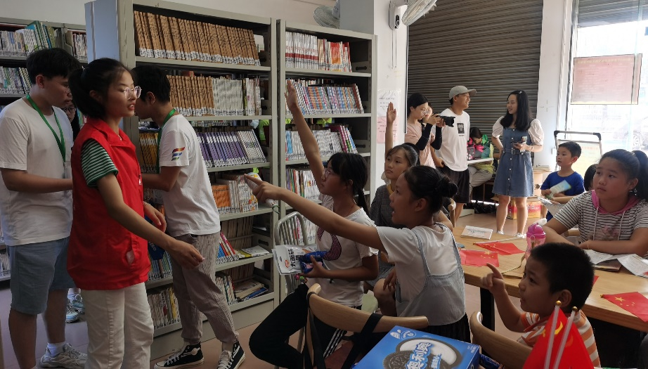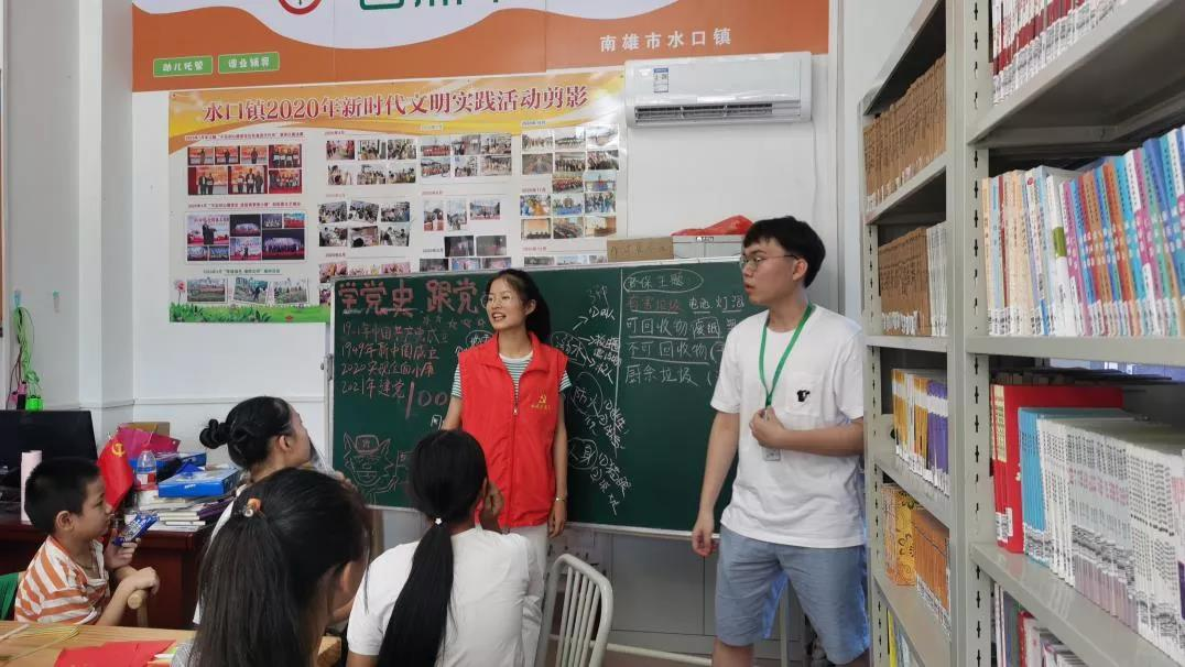 在水口镇文化活动中心,队员们面向小朋友们进行了党史宣讲,通过在黑板上书写党史、朗诵红色经典诗词、歌唱《没有共产党就没有新中国》等形式,让小朋友们了解党的光辉进程。小朋友们挥舞着红旗,了解着小小一面红旗所代表的巨大意义!小朋友们的眼睛里闪烁的团团光芒,印证了中国革命历史是青年们最好的营养剂,愿他们铭记党史,长江后浪推前浪,今朝少年勇自强!
