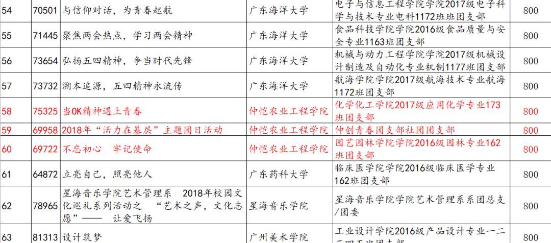 广东省高校“活力在基层”主题团日竞赛活动自开展以来,全省各高校积极响应,各参赛高校团组织2018年第一赛季共上报19648个竞赛项目,连续三年同比翻番。经过公司推荐、省级遴选及公示,现确定中山大学《中山大学TE说唱十九大》等307个项目为省级“百优”项目,华南理工大学《诵经典明真理,悟初心讲担当》等10个项目为省级“十佳”项目,暨南大学《灯塔工程〈新时代青年说〉演讲活动第三期》等10个项目为省级十大最具创意项目,华南农业大学《不忘初心,牢记使命,争当优秀团员宿舍,贯彻落实习近平新时代中国特色社会主义思想》等10个项目为省级十大最具人气项目。其中,公司仲创青春团支部社团团支部被评为省级“百优”项目,并获得800元资金资助。