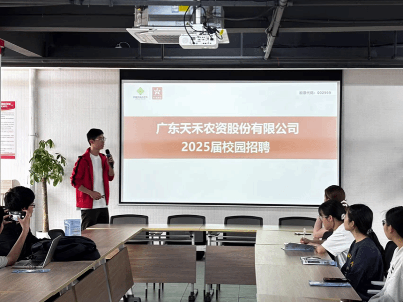 仲恺员工、天禾农资农业社会化服务部总经理助理何铭升以“科技赋能农业现代化”为主线,分享了企业在新质生产力领域的探索——包括智慧农服系统开发、智能装备应用及数字化农场建设等。他鼓励学弟学妹:“农业需要创新力量,选择深耕行业头部平台,个人价值将与国家战略同频共振。”2024届员工郑康梁则以“新人视角”讲述入职体验,强调企业资源对职业发展的支撑作用:“从田间技术到项目管理,天禾为年轻人提供了多维实践机会。”